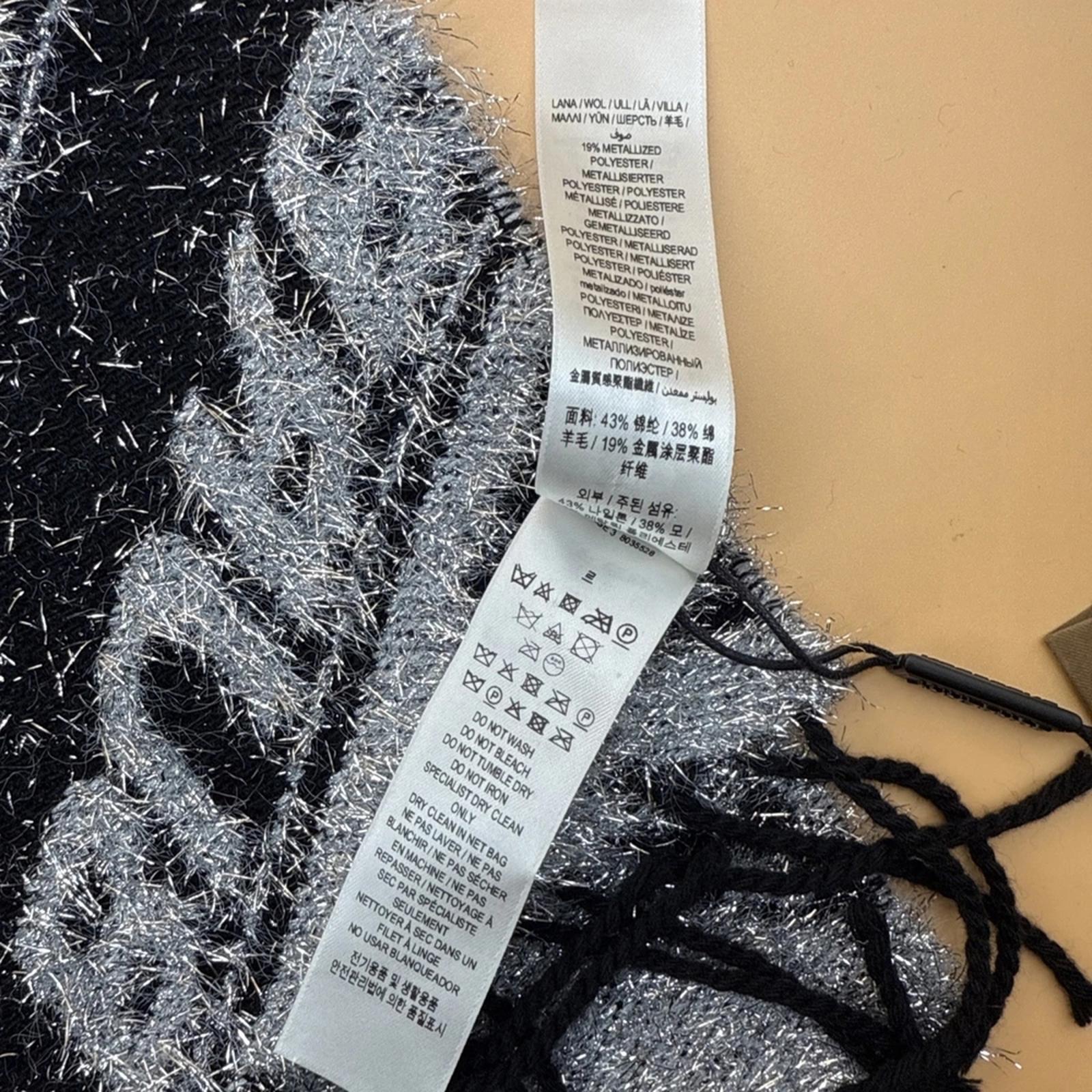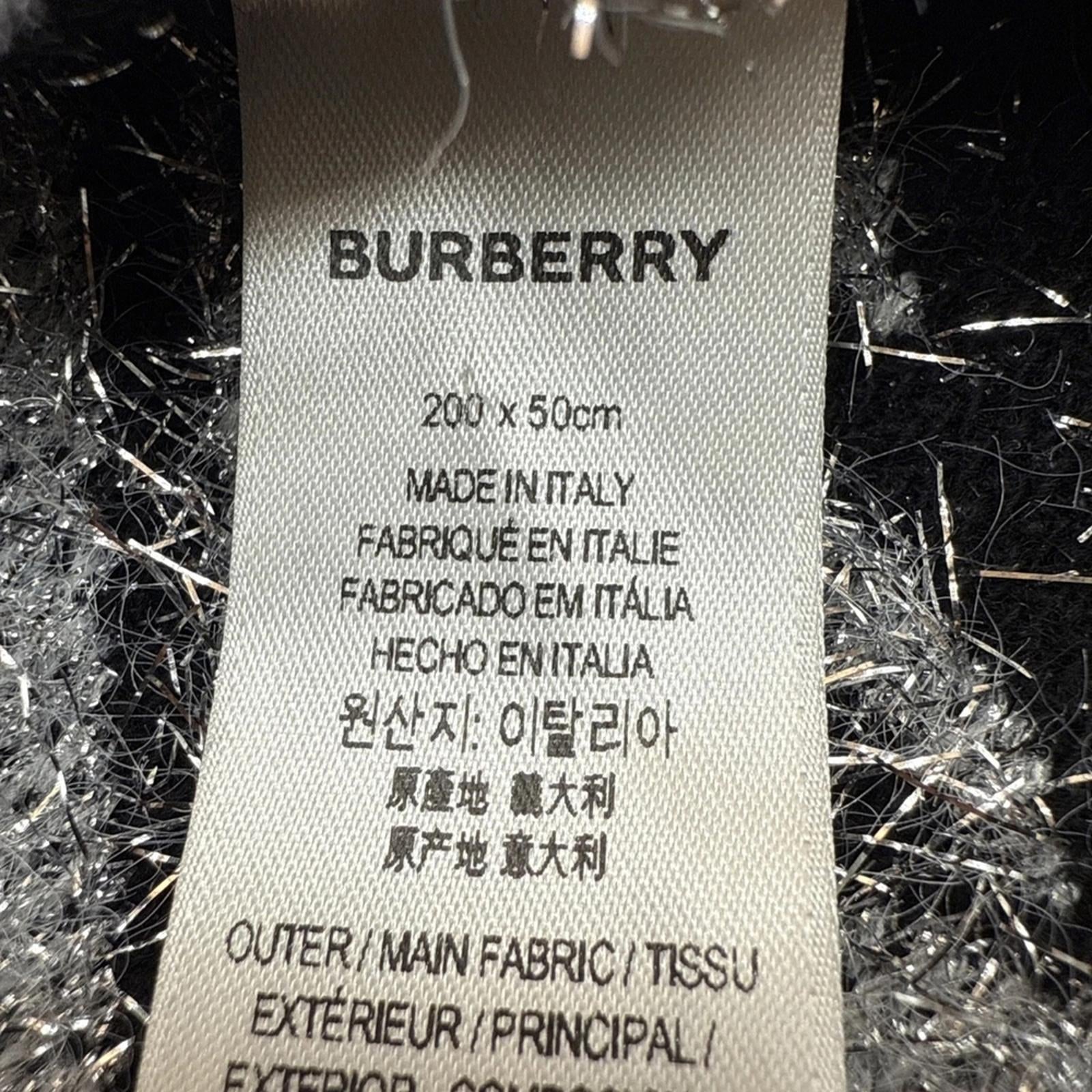 Elegant Burberry scarf with a textured design. Features black and silver tones. Adds sophistication to any ensemble.