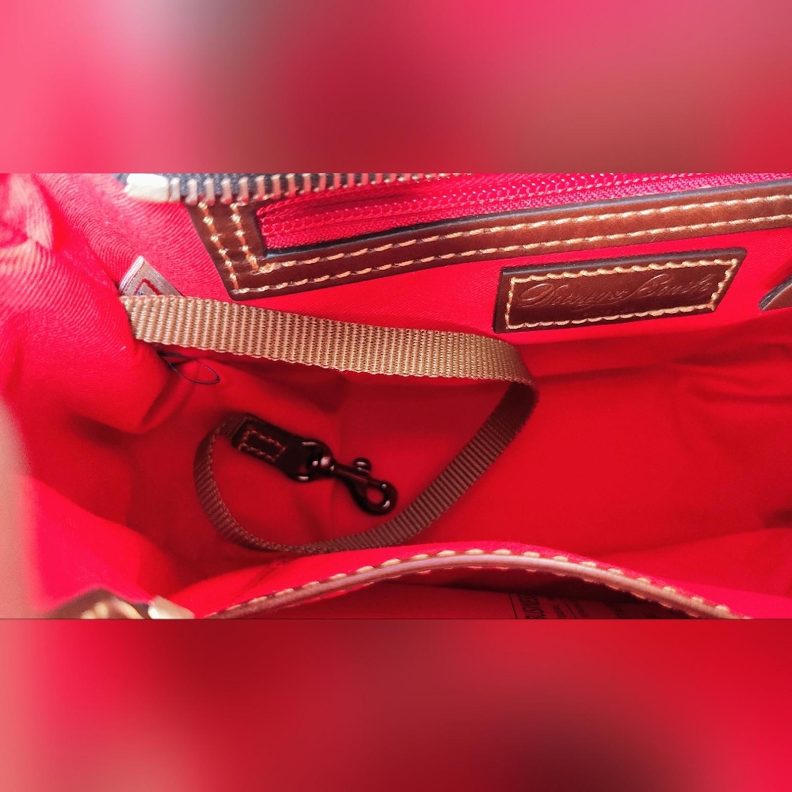 This crescent shaped hobo style shoulder bag features blue pebble grain bone leather with a Dooney&Bourke silver logo lobster claw lock. One inside zip pocket. Brilliant Red interior with Inside key hook. 10” brown leather shoulder strap drop. Includes dust bag. Measures approximately 7” H x 10.5” W x 4.5” D.