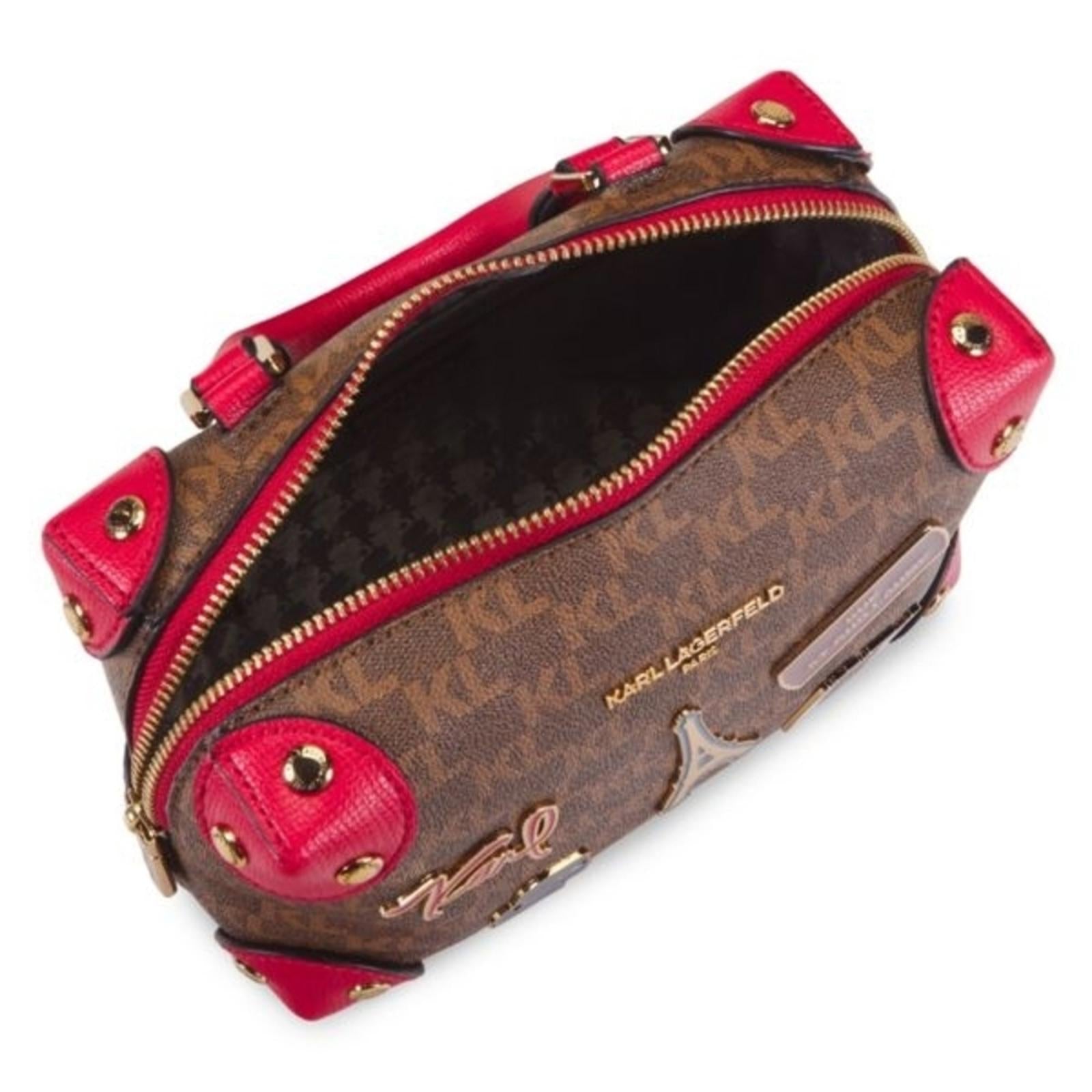 Chic satchel with vibrant red accents. Iconic Karl Lagerfeld design. Ideal for fashion-forward looks.
