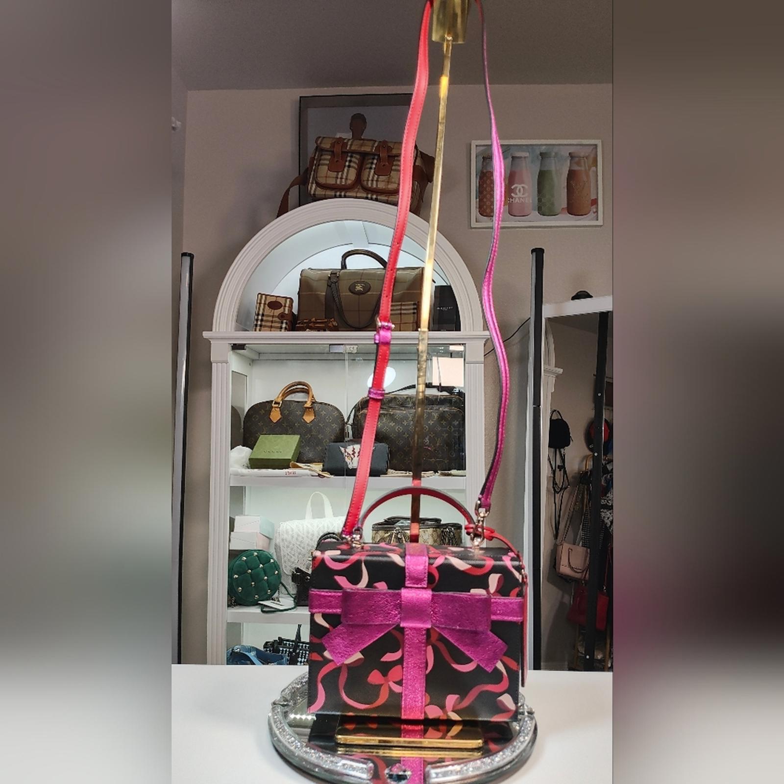 This is a Kate Spade Wrapping Party Gift Box Crossbody bag in refined grain leather with a pink ribbon print design. This bag is perfect for the holidays. weather it be Christmas, Valentine's, graduation, new year's, birthdays.