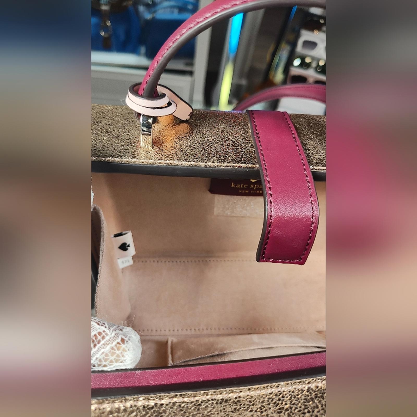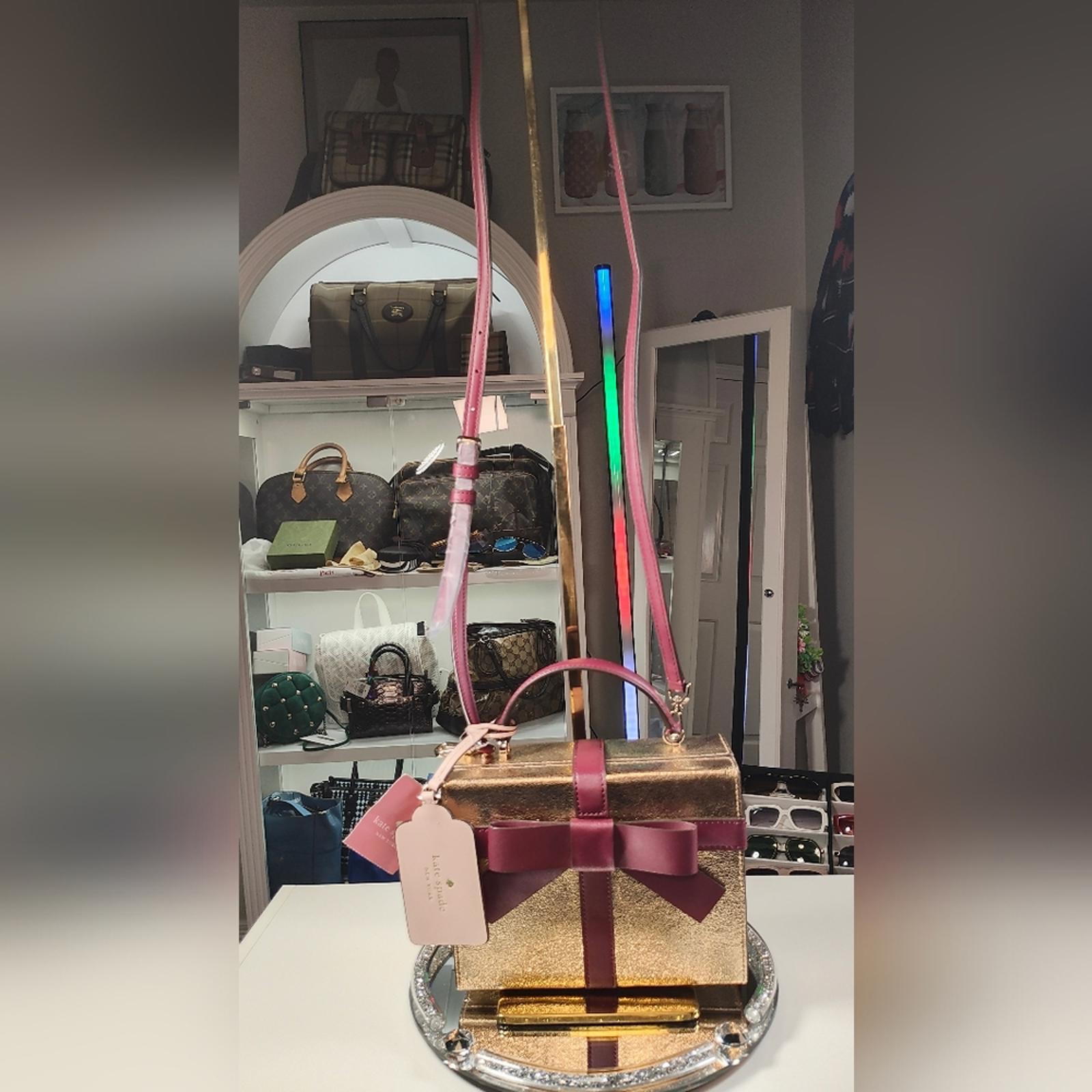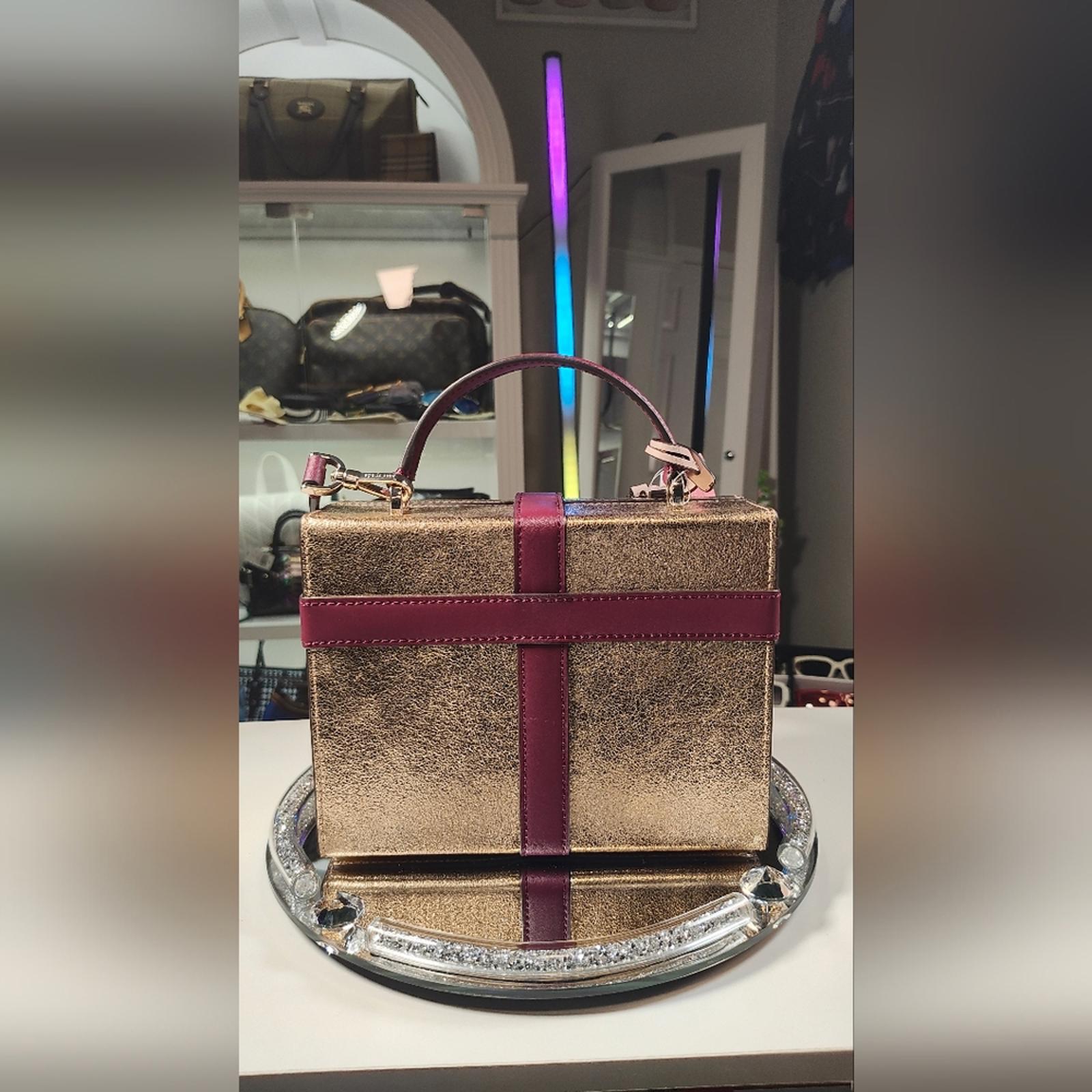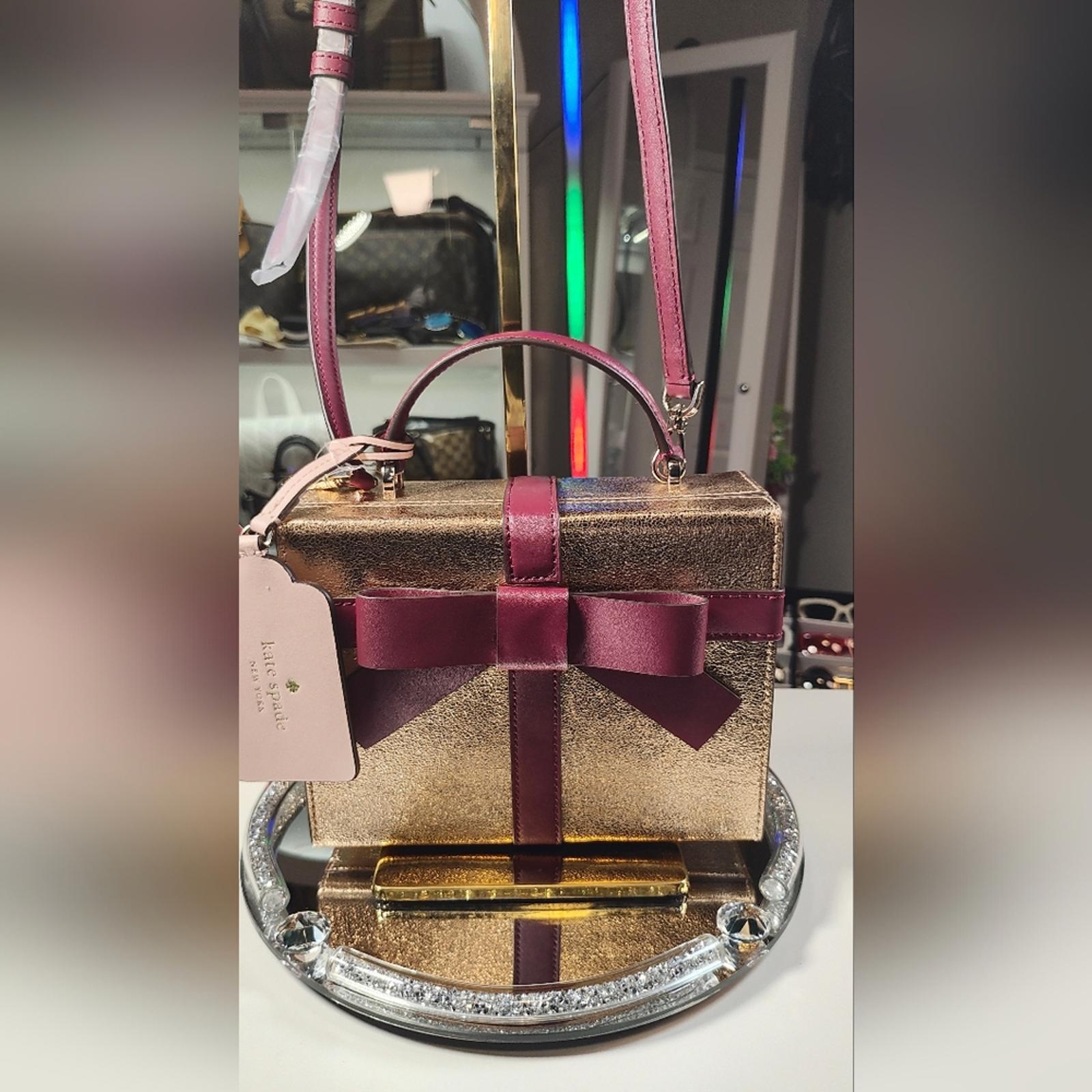 This is a Kate Spade Wrapping Party Gift Box crossbody purse in rose gold with a wine-colored ribbon.