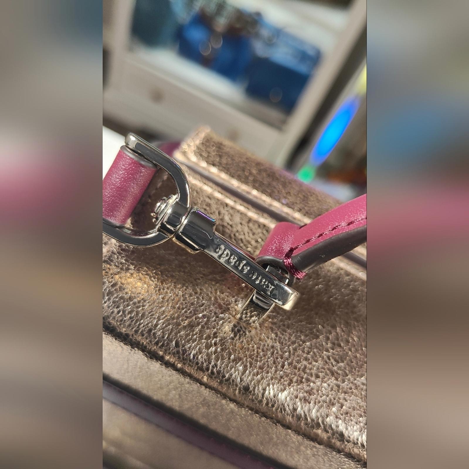 DETAILS 5.74"h x 7.25'W × 2.57"d handle drop: 2.34" strap drop: 24" metallic leather trim: smooth leather foil embossed logo two way spade jacquard lining interior: front credit card slots flap closure with magnetic snap dust bag not included imported style # k4669