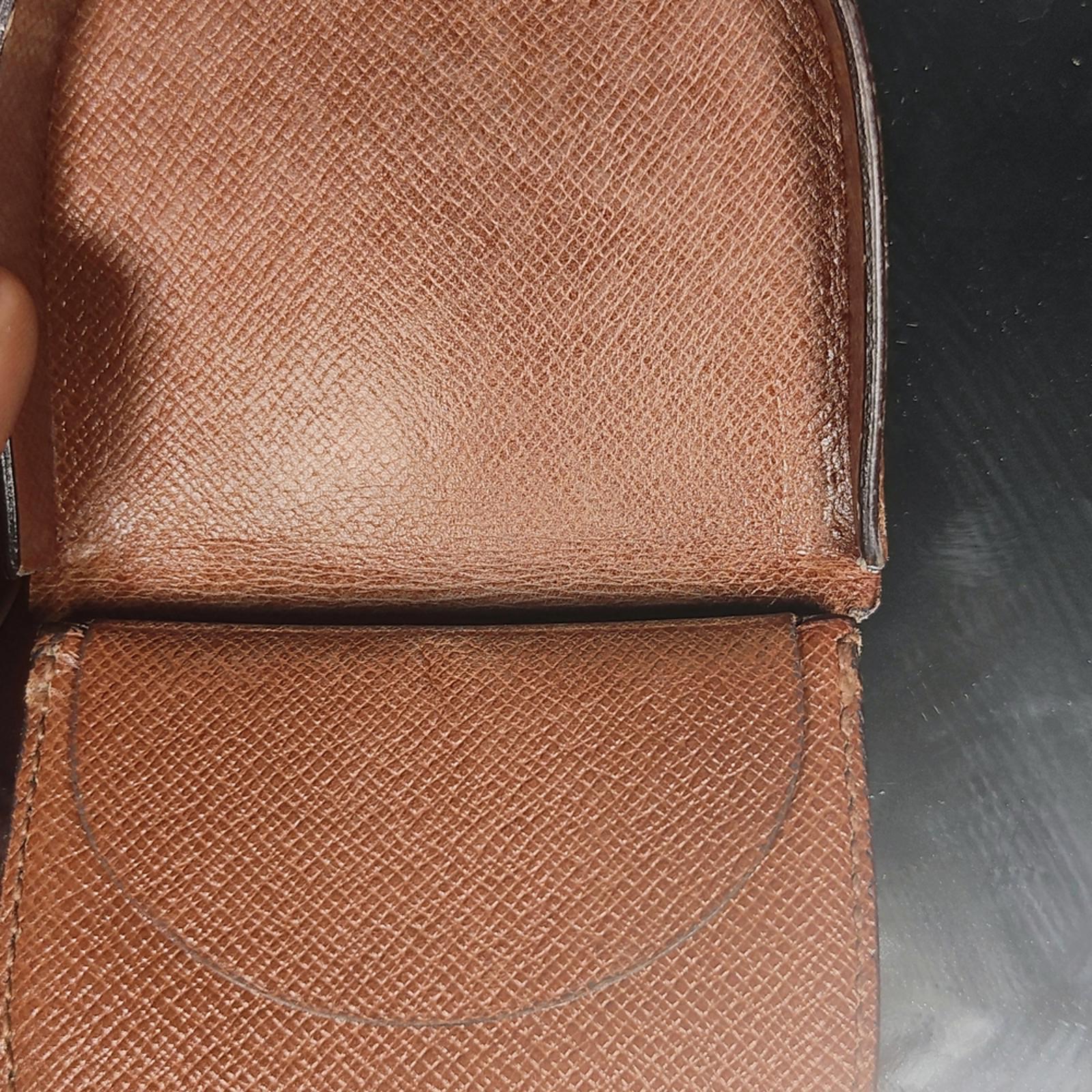Vintage Louis Vuitton coin purse with iconic monogram design. Features brown and gold colors.