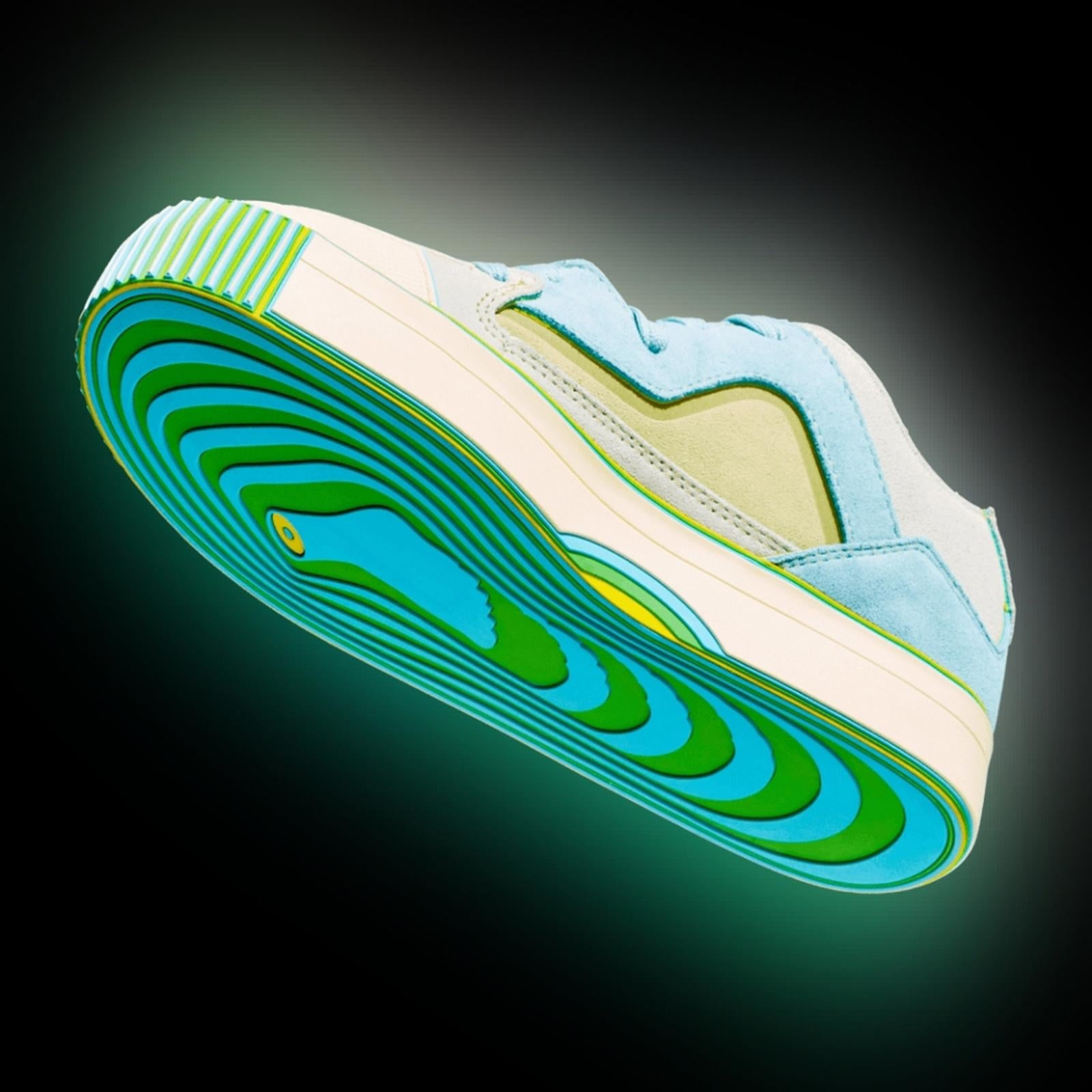 EVERY PART OF THE GOBSTOMPER IS MADE OF 4 LAYERS OF COLORED MATERIAL FROM THE TONGUE TO THE UPPER TO THE SOLE, WHICH REVEAL THEMSELVES AS IT WEARS DOWN, IT FEATURES A SUEDE UPPER AND RUBBERIZED OUTSOLE.